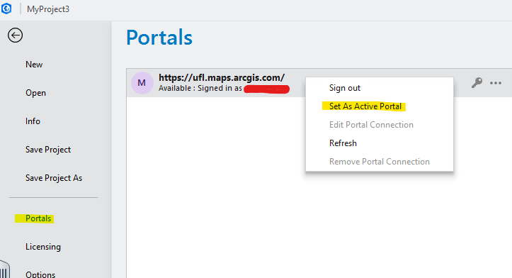 To resolve this problem, Go to the Project Menu, select Portals, then right click on the ufl.maps.arcgis.com selection and select “Set As Active Portal”