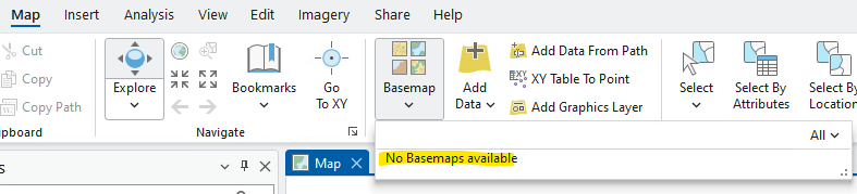 The base maps may be missing when you launch and authenticate ArcGIS Pro:
